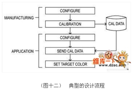 在生產(chǎn)階段,系統(tǒng)可以透過使用標(biāo)準(zhǔn)的CIE相機(jī)進(jìn)行調(diào)校,調(diào)校資料必須儲存在一個(gè)外部的短暫的記憶體中,而系統(tǒng)在導(dǎo)入到應(yīng)用后并不需要進(jìn)行調(diào)校程序。在應(yīng)用上,使用者首先對設(shè)備進(jìn)行組態(tài),接著將先前儲存的調(diào)校資料寫入調(diào)校暫存器,這是一個(gè)簡單的讀出然后寫入的程序,完成后,系統(tǒng)就可以接受目標(biāo)色的輸入。