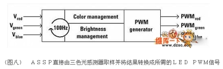 ASSP整合了一系列可以分析三色光感測器色彩資訊,并計(jì)算達(dá)成目標(biāo)色的設(shè)定點(diǎn)及PWM驅(qū)動信號大小的一系列演算法。ASSP以大約每秒一百次的速度對光感測器進(jìn)行取樣,以確保PWM信號的持續(xù)定期調(diào)整不會被人眼察覺,如前面所提,ASSP同時(shí)也包含一個(gè)可以避免LED老化而造成RGB光源輸出色度改變的演算法。