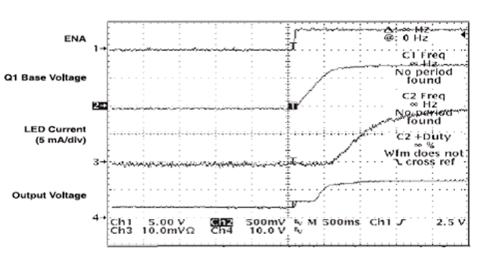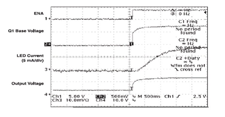 應(yīng)用使能信號(hào) (enable signal) 時(shí),R3 將慢慢給 C3 充電,此舉會(huì)慢慢開啟 Q1。TPS61040 會(huì)通過 D2 被立即啟用。在電路閉合時(shí),F(xiàn)B 到接地的初始電阻極高,從而將 LED">LED 電流限制為 0 mA。隨著 Q1 慢慢開啟,有效電阻逐漸下降,電阻的下降與 LED">LED 電流的升高有直接的關(guān)系。LED">LED 從亮度為 0% 變?yōu)?100% 的亮度,需時(shí) 1 到 2 秒鐘,具體的時(shí)間長(zhǎng)短取決于選定的時(shí)間常數(shù)。圖 3 顯示了電路閉合時(shí)的相關(guān)波形。