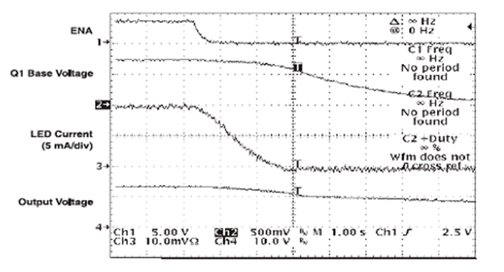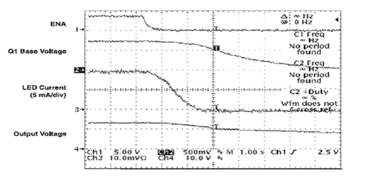 ENA 信號(hào)在電路斷開時(shí)下降,此時(shí) D2 會(huì)阻止 C4 放電。TPS61040 保持開啟狀態(tài),直到 C4 通過 R5 放電。在 TPS61040 仍為開啟狀態(tài)時(shí),C3 開始通過 R3 和 R4 放電。隨著 Q1 可用基線電流 (base current) 的下降,Q1 的有效電阻開始升高。隨著 FB 引腳上總電阻的升高,LED">LED 電流會(huì)成比例下降。圖 4 顯示了電路斷開時(shí)的相關(guān)波形。