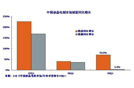 GfK中國發(fā)布的《液晶電視產(chǎn)業(yè)市場(chǎng)季度報(bào)告(09Q1)》顯示:2009年1季度,中國液晶電視市場(chǎng)出現(xiàn)了反彈,銷量達(dá)到476萬臺(tái),比2008年1季度增長(zhǎng)了約70%。