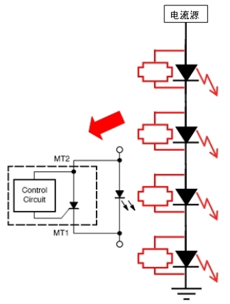 如前所述,LED是一種使用壽命極長(zhǎng)的光源(可長(zhǎng)達(dá)5萬(wàn)小時(shí))。除了需要針對(duì)具體的LED應(yīng)用選擇適合的LED驅(qū)動(dòng)解決方案,還需要為L(zhǎng)ED提供適當(dāng)?shù)谋Wo(hù),因?yàn)榕紶朙ED也會(huì)失效。其原因多種多樣,可能是因?yàn)長(zhǎng)ED早期失效,也可能是因?yàn)榫植康慕M裝缺陷或是因瞬態(tài)現(xiàn)象導(dǎo)致失效。必須對(duì)這些可能的失效提供預(yù)防措施,特別是因?yàn)槟承?yīng)用屬于關(guān)鍵應(yīng)用(故障停機(jī)成本高),或是安全攸關(guān)的應(yīng)用(如頭燈、燈塔、橋梁、飛行器、飛機(jī)跑道等),或是在地理上難于接近的應(yīng)用(維護(hù)困難)等。在這方面,可以采用安森美半導(dǎo)體的NUD4700 LED分流保護(hù)解決方案。圖5是這種分流保護(hù)解決方案的應(yīng)用及原理示意圖。