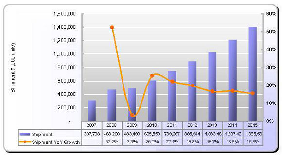 - 2009年估計(jì)出貨將僅超過(guò)約4.8億片,較2008年微幅成長(zhǎng)3.3%;手機(jī)采用觸控面板比重將成長(zhǎng)到51%。