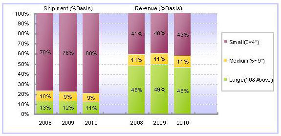 再?gòu)某鲐洺叽鐒e來(lái)看,主要觸控面板的出貨尺寸集中在4寸以下(含4寸),2008年出貨量為3億6,000萬(wàn)片,占整體市場(chǎng)比重將近79%。同樣地,受到全球經(jīng)濟(jì)衰退的影響,2009年在4寸以下(含4寸)的出貨量雖然目前看來(lái)將維持與2008年相仿的水準(zhǔn),但到了2010年預(yù)計(jì)將會(huì)有2%的成長(zhǎng)幅度。