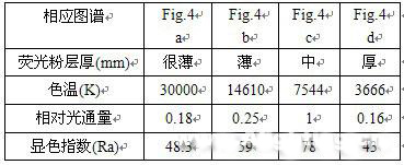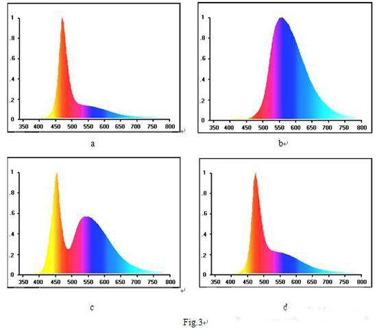 我們?cè)鴮?duì)此進(jìn)行了實(shí)驗(yàn)研究,我們利用某公司生產(chǎn)的1W高亮度藍(lán)光LED,其光譜的中心輻射波長(zhǎng)為470nm見Fig.3,去除外封裝后分別涂敷不同厚度的輻射的中心波長(zhǎng)為560nm的黃光熒光粉涂層,經(jīng)處理后測(cè)量其發(fā)射光譜。從二十余種不同厚度的樣品中選擇了四種典型情況,其結(jié)果見Fig