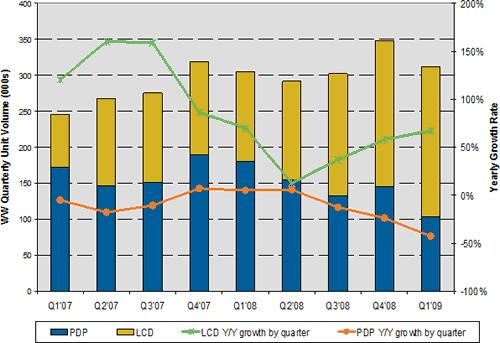 圖一 Q1’09全球26寸及以上尺寸公眾顯示器出貨量與成長率 - 按液晶與等離子顯示器區(qū)分