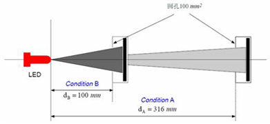 如圖4所示,點光源光強在空間各方向均勻分布,在不同距離處用不同接收孔徑的探測器接收得到的測試結果都不會改變,但是LED由于其光強分布的不一致使得測試結果隨測試距離和探測器孔徑變化。因此,CIE-127提出了兩種推薦測試條件使得各LED在同一條件下進行光強測試與評價,目前CIE-127條件已經(jīng)被各LED制造商和檢測機構引用。