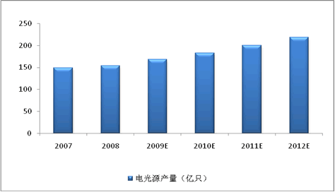 中國電光源(燈泡)行業(yè)能夠持續(xù)快速穩(wěn)定的發(fā)展,其中很重要的原因是產(chǎn)品面向國際和中國兩大市場。在中國和國外消費市場推動下,2008年中國電光源產(chǎn)量達154億只,較2007年同比增長3.5%。隨著中國電光源質(zhì)量和技術標準的提升,預計未來中國電光源產(chǎn)量增長率將為維持9%-12%之間。
