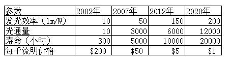 固態(tài)光源OLED目前正處在長(zhǎng)期研發(fā)中,美國(guó)的技術(shù)進(jìn)程詳情可見下表