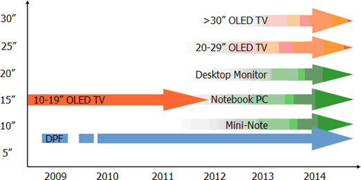 據(jù)DisplaySearch顯示技術研究總監(jiān)Jennifer Colegrove表示,AMOLED面板已成為高端電子產(chǎn)品突顯差異化的主要方式之ㄧ。同時該顯示技術不僅僅可應用于手機主屏,目前已逐步被應用在個人多媒體顯示裝置 (PMP)、數(shù)碼相機等。我們估計接下來3年全球?qū)⒂写蠹s20條新的或者舊線升級AMOLED生產(chǎn)線將會籌備完成。多數(shù)OLED廠商目標仍是希望生產(chǎn)大尺寸OLED TV,以LG Display為例,目前已順利量產(chǎn)小尺寸AMOLED面板,同時宣布今年底要量產(chǎn)15寸電視機面板。LG Electronics擬在今年底假期推出15寸OLED TV;然而Sony于2008年公布了20寸OLED TV之后,2009年尚未計劃推出20寸以上的OLED TV。