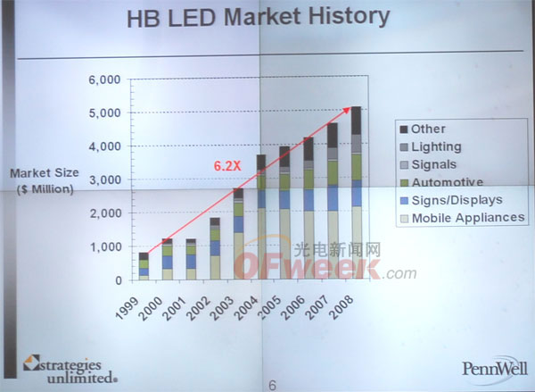 2009年LED持續(xù)擴(kuò)大其在niche和通用照明領(lǐng)域的滲透率,2008年增長55%,2009年由于受經(jīng)濟(jì)衰退的影響估計將增長15%。