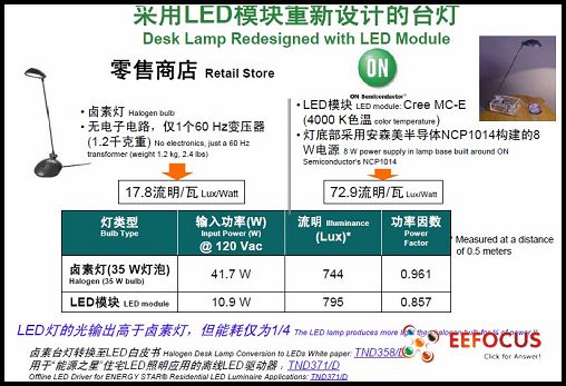 在現(xiàn)場,Laurent Jenck 展示了兩款從零售商店購得的鹵素臺燈(采用35 W燈泡)。一款采用原鹵素燈,另外一款則采用了安森美NCP1014芯片進行穩(wěn)壓改進。原鹵素燈在120 Vac條件下的輸入功率為41.7 W,在0.5米距離處測得的光亮度為744流明。采用了自供電單片式開關穩(wěn)壓器的臺燈在120 Vac條件下輸入功率為10.9 W,即能耗僅相當于鹵素燈的1/4;同時,這LED臺燈在同等距離條件下測得的光亮度為795流明,更優(yōu)于鹵素燈,其72.9流明/瓦(lm/W)的能效(efficacy)更是數(shù)倍于鹵素燈(17.8 lm/W)。