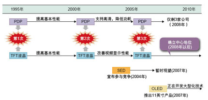 在液晶顯示器市場剛開始啟動的1998年,當(dāng)時的夏普公司社長(現(xiàn)任董事長)町田勝彥的發(fā)言震驚了整個行業(yè)。他表示: “到2005年,夏普在日本國內(nèi)銷售的電視將全部采用液晶屏。” 當(dāng)時,液晶電視并未普及,在夏普公司內(nèi)部對于彩色液晶屏也并沒有十足的把握。但是,這一句話成為液晶電視掃蕩市場的導(dǎo)火索,那以后,液晶電視以超乎町田勝彥預(yù)想的驚人速度推廣開來。在此過程中,液晶與PDP(等離子)、SED(表面?zhèn)鲗?dǎo)電子發(fā)射顯示)等技術(shù)展開了激烈的競爭(見圖3)。