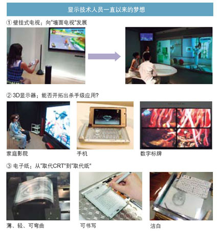 顯示器領(lǐng)域的技術(shù)人員一直以來都有三個夢想:壁掛式電視、3D顯示器及電子紙(見圖4)。