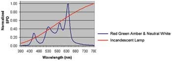 多通道驅(qū)動器:就給定的色溫而言,高質(zhì)量CRI(90以上)會需要多種類型的LED。CRI是光源的光譜能量分布(SPD)的一個(gè)函數(shù)。SPD是指給定波長(頻率)下光源的輻射量。CRI數(shù)值表現(xiàn)最好(97以上)的白熾燈工作壽命較短(750~2500小時(shí)),效率也較低(美國能源部的數(shù)據(jù)為10~17Lm/W)。圖2顯示了白熾燈的SPD曲線與RGB光源曲線的對比情況。