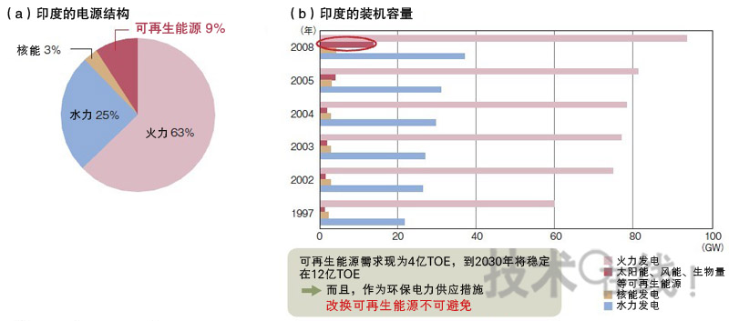 為了解決上面不穩(wěn)定的電力供應(yīng)和環(huán)境問題,可再生能源成為了關(guān)注的焦點(diǎn)。民間調(diào)查機(jī)構(gòu)的推測顯示,到2030年,印度對于可再生能源的需求將增加到現(xiàn)在4億TOE(石油換算噸)的3倍,達(dá)到12億TOE。