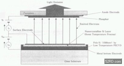 BSD釋放電子時(shí)是利用電子作熱激發(fā),使電子從基板下方注入NPS層,由于奈米結(jié)晶silicon的表面,是利用低溫氧化制程制成氧化薄膜,因此施加的電壓幾乎全部流入該氧化膜層內(nèi)進(jìn)而形成強(qiáng)電界領(lǐng)域,而氧化膜的厚度非常的薄,所以電子很容易將強(qiáng)電界領(lǐng)域的氧化膜變成tunnel,并進(jìn)入鄰接的奈米結(jié)晶silicon內(nèi),隨著電子通過氧化膜被加速,并朝向表面電極方向前進(jìn),如此反覆相同動(dòng)作所以到達(dá)表面附近的電子,具備比熱平衡狀態(tài)更高的運(yùn)動(dòng)能量,而表面電極也變得很容易將成為tunnel的電子釋放至真空中。