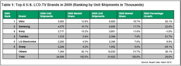據(jù)iSuppli公司,Vizio在2009年成為美國(guó)市場(chǎng)的領(lǐng)先液晶電視品牌,而三星電子則在總體平板電視市場(chǎng)排名第一。