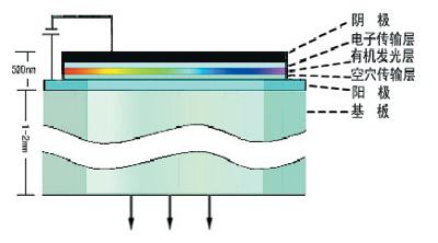 OLED是指有機半導體材料和有機發(fā)光材料在電場的驅動下,通過載流子注入和復合導致發(fā)光的技術。其原理是用ITO玻璃透明電極和金屬電極分別作為器件的陽極和陰極,在一定電壓驅動下,電子和空穴分別從陰極和陽極注入到電子傳輸層和空穴傳輸層,然后分別遷移到發(fā)光層,相遇后形成激子使發(fā)光分子激發(fā),后者經過輻射后發(fā)出可見光。輻射光可從ITO一側觀察到,金屬電極膜同時也起了反射層的作用。下圖是一個簡單的OLED器件結構示意圖。