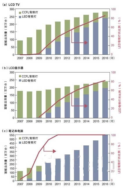 - 以電視為中心的大型液晶面板正逐步采用LED背照燈