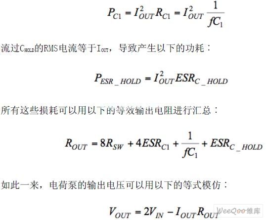 電荷泵的寄生效應導致輸出電壓隨著負載電流的增加而下降。事實上,總是存在2IOUT的RMS電流流過C1和兩個開關(2Rsw),導致產生以下的功耗︰