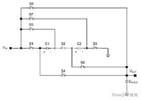 電壓升壓是通過以下的模式完成︰通過關閉S8并保持S1到S7打開,電壓轉換可以獲得1倍的增益。