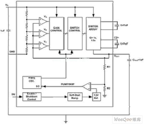 下調的輸出電壓通過PUMP/SKIP比較器與1.2V的電壓基準比較。PUMP/SKIP比較器輸出電壓在啟動時線性上升,提供軟啟動功能。當輸出電壓超過期望的極限,器件不會開啟,消耗的電源電流將很小。在這種空閑狀態(tài)的期間,輸出電容CHOLD提供輸出負載電流。隨著這個電容不斷放電以及輸出電壓降低到期望的輸出電壓以下,電荷泵被激活直到輸出電壓再次達到高于這個值。