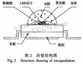 Si襯底的功率型GaN基LED封裝采用仿流明的支架封裝形式,其外形有朗柏型、矩形和雙翼型。其制作過程為:使用導(dǎo)熱系數(shù)較高的194合金金屬支架,先將LED芯片粘接在金屬支架的反光杯底部,再通過鍵合工藝將金屬引線連接LED芯片與金屬支架電極,完成電氣連接,最后用有機(jī)封裝材料(如Si膠)覆蓋芯片和電極引線,形成封裝保護(hù)和光學(xué)通道。這種封裝對于取光效率、散熱性能、加大工作電流密度的設(shè)計都是最佳的。其主要特點(diǎn)包括:熱阻低(小于10℃/W),可靠性高,封裝內(nèi)部填充穩(wěn)定的柔性膠凝體,在-40~120℃范圍,不會因溫度驟變產(chǎn)生的內(nèi)應(yīng)力,使金絲與支架斷開,并防止有機(jī)封裝材料變黃,引線框架也不會因氧化而沾污;優(yōu)化的封裝結(jié)構(gòu)設(shè)計使光學(xué)效率、外量子效率性能優(yōu)異,其結(jié)構(gòu)見圖2。