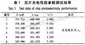 通過優(yōu)化Si襯底表面的處理和緩沖層結(jié)構(gòu),成功生長出可用于大功率芯片的外延材料。采用Pt電極作為反射鏡,成功實(shí)現(xiàn)大功率芯片的薄膜轉(zhuǎn)移。采用銀作為反射鏡,大大提高了反射效率,通過改進(jìn)反射鏡的設(shè)計并引入粗化技術(shù),提高了光輸出功率。改進(jìn)了Ag反射鏡蒸鍍前p型GaN表面的清洗工藝和晶片焊接工藝,改善了銀反射鏡的歐姆接觸,量子阱前引入緩沖結(jié)構(gòu),提高了芯片發(fā)光效率,優(yōu)化量子阱/壘界面生長工藝,發(fā)光效率進(jìn)一步提高,通過改進(jìn)焊接技術(shù),減少了襯底轉(zhuǎn)移過程中芯片裂紋問題,芯片制備的良率大幅度提高,且可靠性獲得改善。通過上述多項技術(shù)的應(yīng)用和改進(jìn),成功制備出尺寸1mm×1mm,350mA下光輸出功率大于380mW的藍(lán)色發(fā)光芯片,發(fā)光波長451nm,工作電壓3.2V,完成課題規(guī)定的指標(biāo)。表1為芯片光電性能參數(shù)測試結(jié)果。