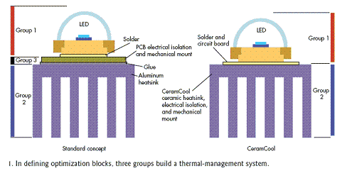 僅優(yōu)化散熱器的作法很常見。目前已有上百種散熱器設(shè)計(jì),它們基本上都由鋁構(gòu)造。但為進(jìn)一步改進(jìn)性能,有必要提升甚至取消Group3。電氣隔離功能必須通過其它材料從散熱器本身獲得。我們認(rèn)為這種材料應(yīng)該是陶瓷。諸如Rubalit(氧化鋁)或Alunit(氮化鋁)等陶瓷材料將兩個(gè)關(guān)鍵特性:電絕緣和熱傳導(dǎo)結(jié)合在一起。
