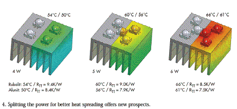 將熱點(diǎn)的溫度降低6k意味著可顯著減少LED的壓力。相同形狀Rubalit組件的總熱阻至少比鋁要好13%。使用Alunit可將CeramCool性能提升最少31%。如果考慮28K的熱降,則Rubalit和Alunit這兩種陶瓷材料帶來的實(shí)在的好處更要顯著得多。