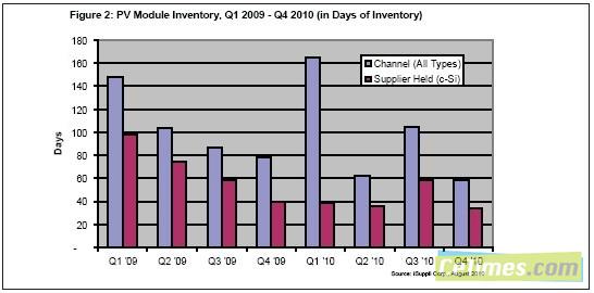 圖2所示為2009年第一季度至2010年第四季度的光伏模組庫存圖表,顯示了主宰該市場的可能動態(tài)。