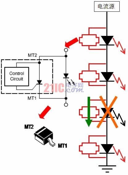 增強(qiáng)LED串可靠性的保護(hù)方案如前所述,區(qū)域照明應(yīng)用中通常會采用多串LED。雖然LED本身的可靠性很高,但如果LED串中的某個LED發(fā)生開路故障,那么整串LED就可能關(guān)閉,而街道照明等應(yīng)用中就要避免這種狀況,從而降低后期維護(hù)成本。有鑒于此,安森美半導(dǎo)體推出了NUD4700 LED電流旁路保護(hù)器(見圖3)。這器件是一款分流器件,萬一LED串中某個LED開路,則會提供電流旁路,確保在某個LED故障的條件下整串LED不會關(guān)閉;而且恰當(dāng)處理散熱的話,還可支持大于1 A的大電流。