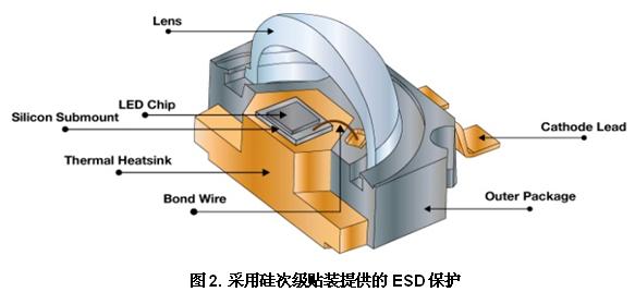 圖2顯示了如何在LED和引線框之間應用硅次級貼裝來更緊密地集成ESD保護。這種構(gòu)造使LED外形尺寸更緊湊;次級貼裝替代側(cè)面貼裝LED模塊中使用的傳統(tǒng)襯底,提供的ESD保護等級超過15 kV HBM。硅次級貼裝的良好熱傳導性也幫助LED緩解由于LED與引線框熱膨脹系數(shù)不同導致的應力。