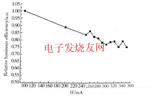 當(dāng)電流增加時,注入發(fā)光區(qū)的電子發(fā)生非輻射復(fù)合的幾率變大,使器件的內(nèi)量子效率降低,同時,由于電流增加導(dǎo)致器件的溫度升高,使熒光粉的量子效率降低并進(jìn)一步增加了非輻射復(fù)合的幾率。在圖5中,由于驅(qū)動電流在正常的工作電流內(nèi),器件的發(fā)光效率雖有一定的降低,但變化的幅度并不大。