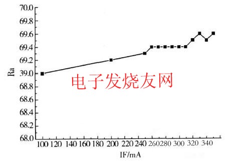由于藍(lán)光LED與$熒光粉組成的白光系統(tǒng),其光譜中缺少紅光成分,顯色指數(shù)還不理想,這也是目前業(yè)界研究的重點課題。顯色指數(shù)與光譜成分有關(guān),電流增加但并不影響出光的光譜的分布,所以器件的顯色指數(shù)幾乎沒有變化。