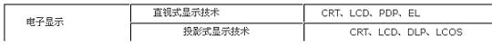 電子顯示又有很多類別,我們可以簡單地將其分為直視式和投影式兩種。每種方式又包含多種顯示技術,如下表所示: