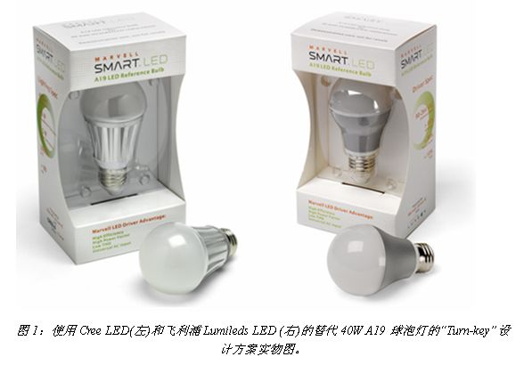 目前Marvell公司提供的超低功耗A19型交鑰匙設(shè)計方案和燈泡實物包括兩種(見圖1),均可用于替代40W的A19型球泡白熾燈:一種是采用4顆照明級別Cree XLamp® XP-E高效白光LED的方案;另一種是采用飛利浦Lumileds LUXEON® A LED的方案。此外,Marvell還推出了采用Cree XLamp® MT-G產(chǎn)品的PAR38射燈交鑰匙解決方案,用于替代100W的傳統(tǒng)此類燈具。同時,Marvell還在開發(fā)A19 60W等效LED燈泡方案,很快也將與中國客戶見面。