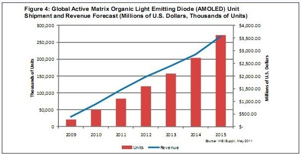 AMOLED正在迅速成為智能手機(jī)青睞的顯示器,2010-2015年全球出貨量將擴(kuò)張近五倍。