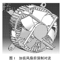 主動散熱常用液冷、熱管、風(fēng)冷等方式。由于液冷使用的液體必須在泵的帶動下強(qiáng)制循環(huán)帶走散熱器的熱量,熱管則依靠高導(dǎo)熱性能的傳熱元件在全封閉真空管內(nèi)的液體的蒸發(fā)與凝結(jié)來傳遞熱量,二者都不適合車燈內(nèi)使用。風(fēng)冷散熱具有價(jià)格較低、安裝簡單等優(yōu)點(diǎn)最為常用。針對被動散熱方式存在的散熱器中心區(qū)域溫度相對集中的情況,加裝風(fēng)扇強(qiáng)制對流后(見圖1),對緩解散熱器溫度不均勻有明顯效果。