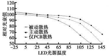 圖4是LED光源溫度與光衰在不同的散熱方式下的關(guān)系曲線。圖中可見僅PCB散熱、加散熱器的被動散熱和強(qiáng)制對流的主動散熱3種不同散熱設(shè)計(jì)存在相當(dāng)大的差異。后二種在105℃時(shí),基本上能夠提供80%以上的出光率。
