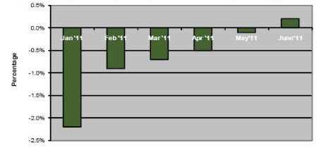 下圖所示為IHS iSuppli公司對(duì)今年1到6月大尺寸液晶面板價(jià)格逐月走勢(shì)的預(yù)測(cè)。大尺寸液晶面板,是指對(duì)角尺寸為10.1至55英寸及以上的面板。