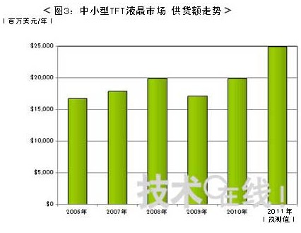 圖3表示中小型液晶市場(chǎng)過去5年內(nèi)的業(yè)績(jī)與今年的供貨額預(yù)測(cè)。手機(jī)及數(shù)碼相機(jī)等使用的中小型FPD因價(jià)格不斷降低,市場(chǎng)范圍逐步擴(kuò)大,導(dǎo)致中小型液晶 市場(chǎng)的供貨額與供貨量增長(zhǎng)幅度相比,持續(xù)出現(xiàn)了低增長(zhǎng),因2008年雷曼危機(jī)后消費(fèi)低迷,這一市場(chǎng)陷入了供貨額大幅減少的局面。在此期間,許多中小型液晶 廠商都有過力圖通過縮小業(yè)務(wù)而生存下去的辛酸經(jīng)歷,包括同行業(yè)廠商間的業(yè)務(wù)撤銷與合并以及淘汰設(shè)備等。