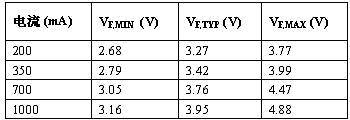 表 1:大電流白光 LED 的正向壓降與驅(qū)動(dòng)電流。