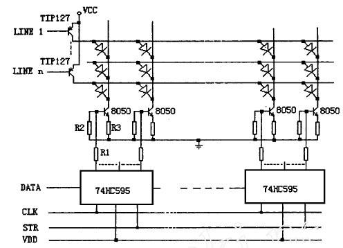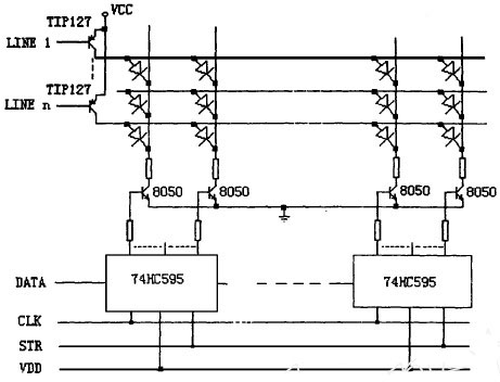 常規(guī)型驅(qū)動電路的設(shè)計(jì)一般是用串入并出的通用集成電路芯片如74HC595或MC14094 等作為列數(shù)據(jù)鎖存,以8050 等小功率NPN 三極管為列驅(qū)動,而以達(dá)林頓三極管TIP127等作為行掃描管,其電路如圖1 所示。