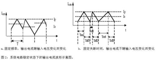 從電感的計算公式可以看出這兩者之間的差異性,圖1a中的電感計算式為L = (Vin–Vo) * Ton /ΔI ,圖1b中的電感計算式為L=Vo*Toff/ΔI。Io=Ip-ΔI /2。如圖2所示電流波形示意圖,電感確定后,圖2a中輸入電壓Vin變化導(dǎo)致紋波電流ΔI變化,以致輸出電流變化;圖2b中的紋波電流ΔI與輸入電源電壓無關(guān)。因此在電壓波動較大的寬電壓應(yīng)用環(huán)境下,使用恒定關(guān)斷時間電路方式。