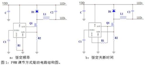 按照PWM調(diào)節(jié)方式,可以分成恒定頻率和恒定關(guān)斷時間兩類(圖1)。