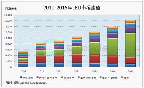 集邦科技旗下研究部門LEDinside近期發(fā)表的研究報告顯示,2011年的全球高亮度LED產(chǎn)值預(yù)估由2011年初106億美元下修至90億美元(年增率僅8%)。主要原因在于背光市場不如預(yù)期,加上LED的平均售價快速下滑導(dǎo)致LED產(chǎn)業(yè)供過于求。