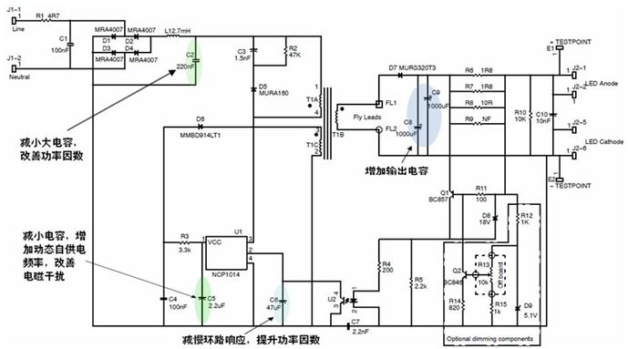 圖6:改善了功率因數(shù)的NCP1014應(yīng)用電路圖