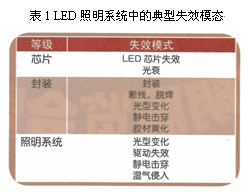 LED模組和燈具的典型失效模式包含了不同層次的失效模式,涉及到LED封裝結(jié)構(gòu)以及工藝過程(如表1)。LED在實(shí)際使用中,由于復(fù)雜的環(huán)境以及封裝工藝局限性從而使封裝材料退化、熒光粉退化、金屬電遷移、局部溫度過高產(chǎn)生的熱應(yīng)力所引起的芯片和硅膠的分層或金線斷裂等等,從而影響LED發(fā)光甚至導(dǎo)致整個(gè)LED的失效。而且LED產(chǎn)生的高溫會(huì)導(dǎo)致芯片的發(fā)光效率降低,光衰加快、色移等嚴(yán)重后果。